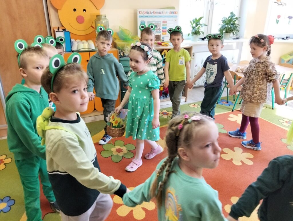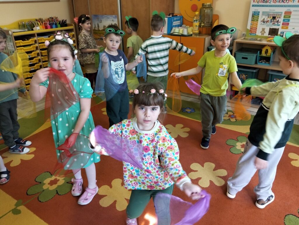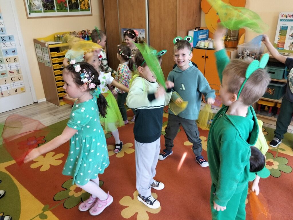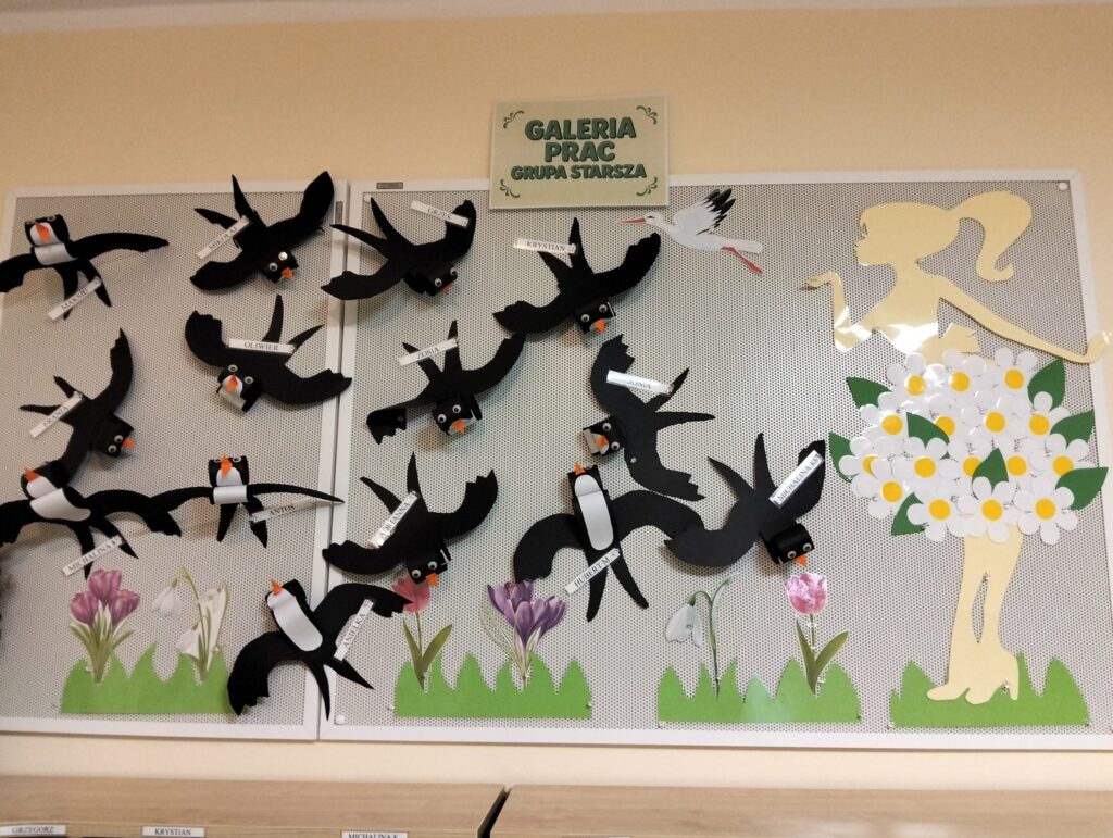 Dzieci ubrały się z tej okazji w kolorze zielonym, który symbolizuję tę porę roku. Przywitanie rozpoczęliśmy recytacją wiersza pt. „Wiosna” następnie obejrzeliśmy film edukacyjny i rozwiązywaliśmy zagadki o nowej porze roku, zaśpiewaliśmy również radosną piosenkę o wiośnie. Dzieci uczestniczyły w wielu zabawach ruchowych z Panią Wiosną i z Bocianem, Tańczyły do utworu „Cztery pory roku – Wiosna” A. Vivaldiego. Uzupełniły kalendarz pogody zaznaczając porę roku, miesiąc, dzień, temperaturę powietrza, pogodę, Dzień wcześniej dzieci samodzielnie zrobiły na zajęciach plastycznych przestrzenne jaskółki i na koniec posiały rzeżuchę, którą w najbliższych dniach będziemy obserwować jak rośnie. To był piękny i radosny dzień dla naszych przedszkolaków.